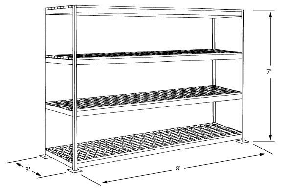- Assemble shelving units, each with a grid of 8ga steel wire. For heavier objects, it may be desirable to use heavier gauge wire. Individual shelves can be ordered to any desired dimensions. It is possible to provide a lip on the shelf by installing steel angle iron (e.g., 31/2in x 21/2in), available from local sheet metal shops and hardware stores. fasten the lips to shelves with screws.