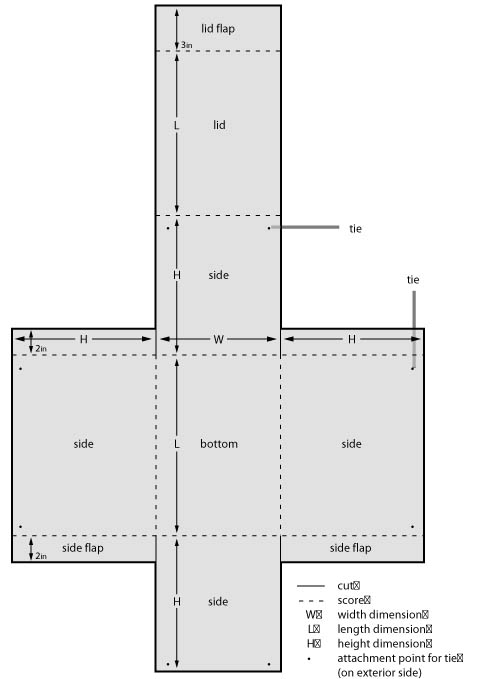 9. Fold the lid down. To secure the lid, ties may be added to either side of the lid flap and to the sides of the box perpendicular to the lid flap.