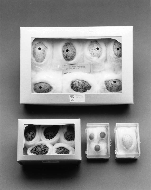Transparent polystyrene boxes are used for storing individual or multiple small eggs. For larger eggs and larger groups of eggs, boxes made from pH neutral board with metal edges and a polyester film window in the lid, provide strong, non-reactive, see-through storage. Cotton “wool” or batting, and polyester needle-punched batting are used as padding (Fig. 1).