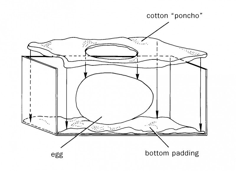 bottom center, Polystyrene box with clutch of three eggs in a poncho with three holes.