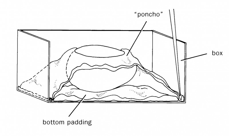 Figure 2. The bottom of the box is padded and a cotton poncho is prepared. - Tuck the cotton poncho down the sides of the box, pushing it between the bottom layer of cotton and the box side (Fig. 3). A dull-pointed, smooth tool such as a Japanese lacquered chopstick or the handle of small paint brush is handy for this step.