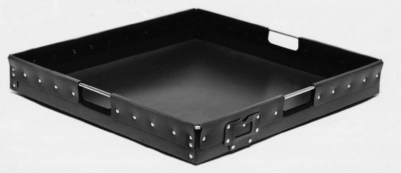 The polished steel lip-frame provides a front-pull, and side carrying handles at these three points. A label holder of the same plastic is riveted to the front of the drawer.