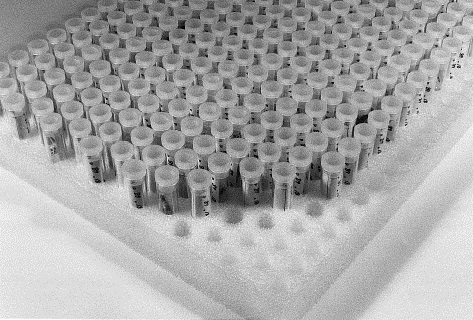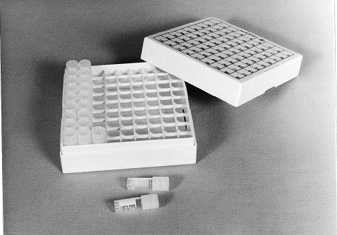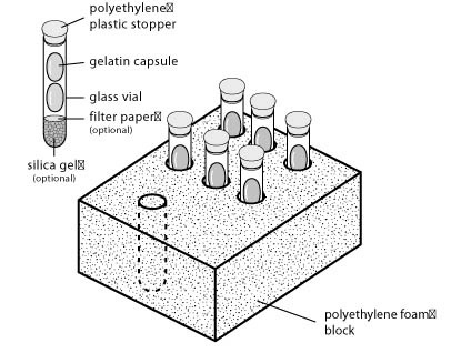 The capsules, which can be marked with catalog information in ink, are placed (two at a time) in plastic-stoppered glass vials, with an appropriate label placed either inside the vial or on the outside. The vials are then positioned in polyethylene foam planks drilled to accommodate the rows of vials (Fig. 1).
