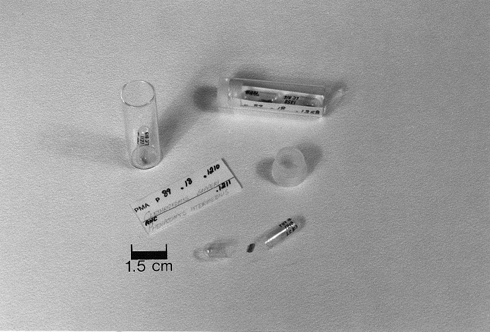 Figure 3. Small specimen at lower center is placed in gelatin capsules that are stored in glass vials.