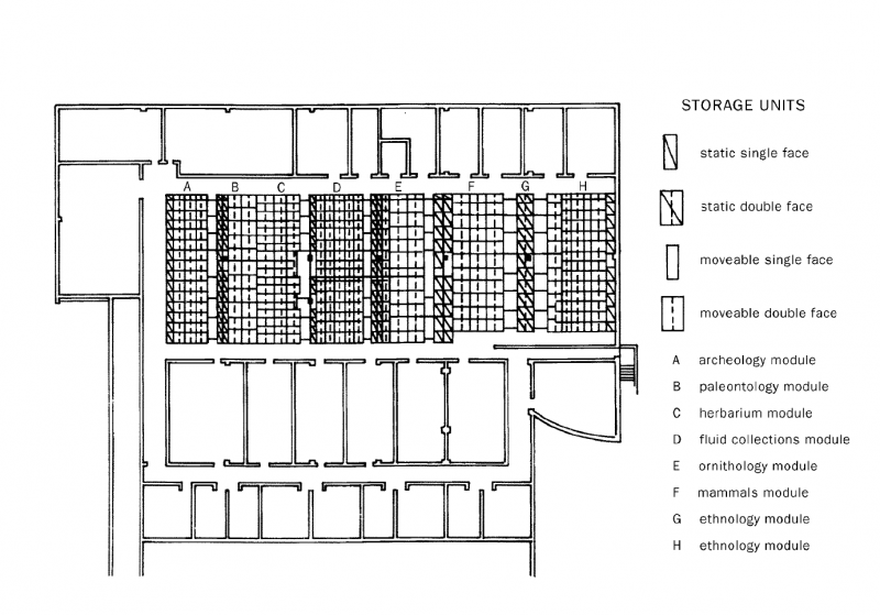 top right, Existing storage cabinets are stacked 3 high, back to back on recessed, mobile carriages. Drawers are coated and thickly lined with pH neutral blotters.