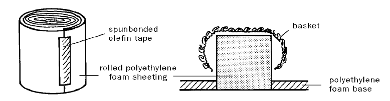 - Tightly roll the strips and secure the ends with spunbonded olefin tape with acrylic adhesive. A 40in strip will make a cylinder with a 21/2in diameter. For deep round baskets, the diameter of the roll should be slightly less than the rim opening (Fig. 1). Oval baskets may require two supports. The foam is soft enough so that additional padding is normally not necessary.