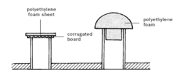 Central supports also can be made from sections of pH neutral cardboard tube, or strips of pH neutral corrugated board folded into a square pillar. It is easier to cut square holes in the base sheet than round ones. Both of these alternatives require an additional top sheet of corrugated board plus a layer of polyethylene foam sheeting for padding. The square pillar also would require padding around the sides when used with deep objects.