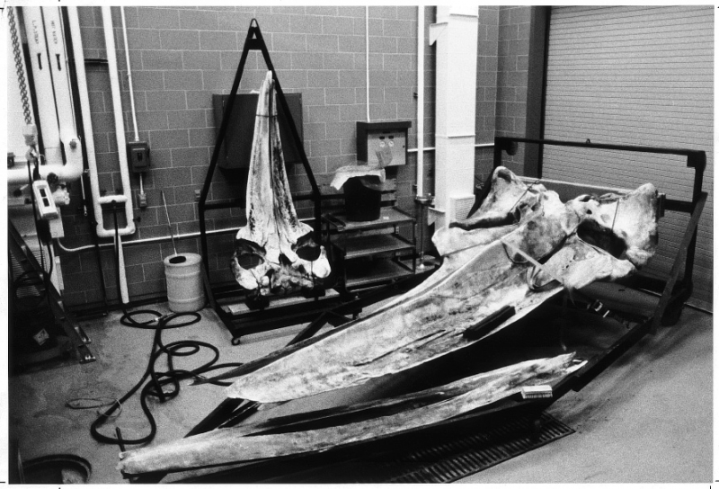 Figure 1. Metal support cradles with fin whale skulls in vertical and horizontal positions.