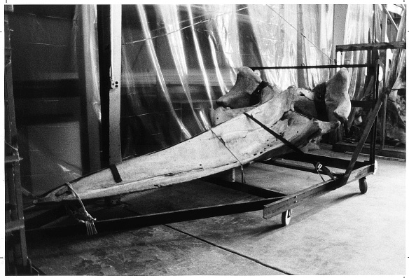 For a large finback whale skull, Balaenoptera physalus, a frame was constructed out of 4in and 5in channel. This specimen was approximately 18ft long, 12ft wide, 41/2ft deep and weighed approximately 1500lbs. The cradle should be built slightly larger than the skull on each dimension so that no portion of the specimen overhangs the cradle.