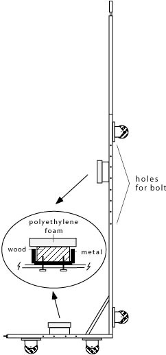 Figure 2. Metal support frame. left, Side view showing detail of metal, wood, and foam pads. right, Front view.
