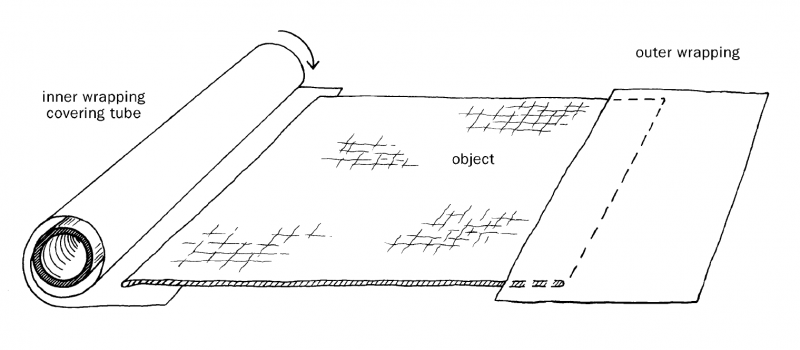 The object is rolled on a tube. An inner wrapping covers the tube and secures the leading edge of the object. An outer wrapping secures the outside edge of the object and acts as a dust cover (Fig. 1). The roll closure is secured by tubular netting or twill tape ties. The orientation of the object and interleaving protect the object’s structure.